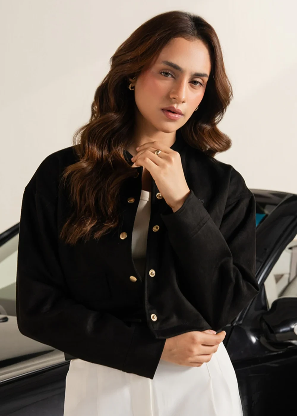 Tailored in soft-touch suede, the Cropped Suede Jacket brings together modern minimalism and timeless elegance. Its structured silhouette, cropped length, and gold-tone button detailing create a sophisticated contrast of edge and polish. Lightweight yet substantial, it transitions effortlessly from day to evening — a wardrobe statement that pairs seamlessly with high-waisted trousers or skirts.