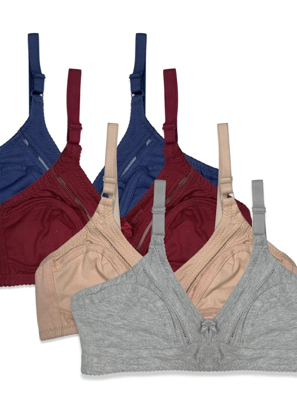 Add some style and comfort to your daily wear with this Pack of 4 Bra in four beautiful colors. Made with soft lace and a cute bow in the center, these bra are perfect for wearing every day. They’re comfortable, breathable, and have adjustable straps for the best fit. Whether you're at work, hanging out, or just relaxing at home, these bralettes keep you comfortable all day long. Features: Soft Cotton fabric that feels soft on the skin Non-padded cups for a natural shape Wire-free design for extra comfort Soft, stretchable straps for better fit Lace detailing adds a gentle touch Adjustable straps for custom support Bow accent for a simple, neat look Pack of 4: Four stylish bralettes to add to your wardrobe.