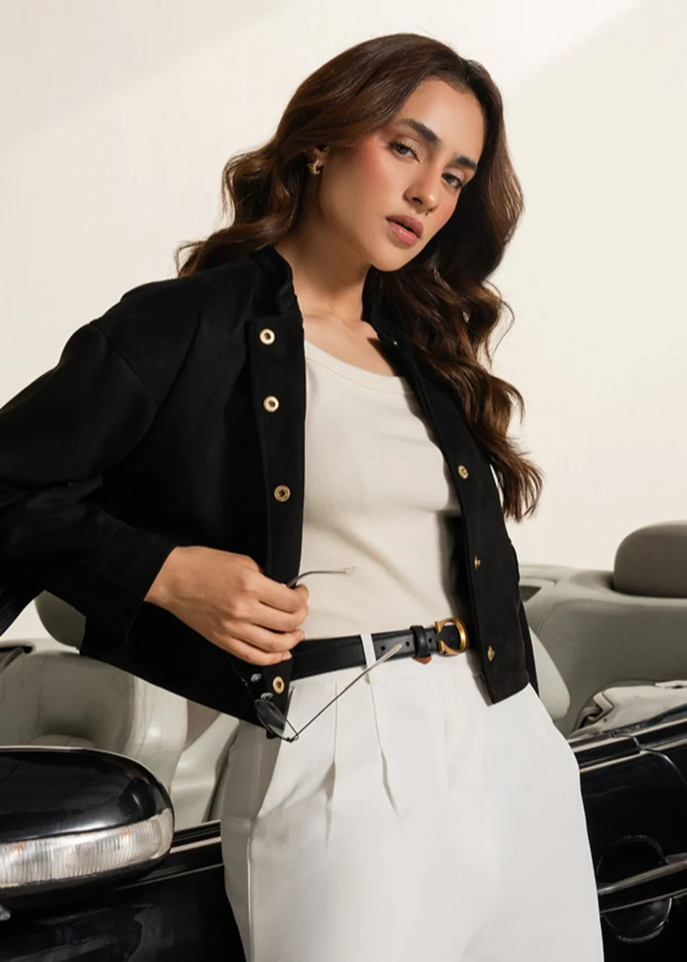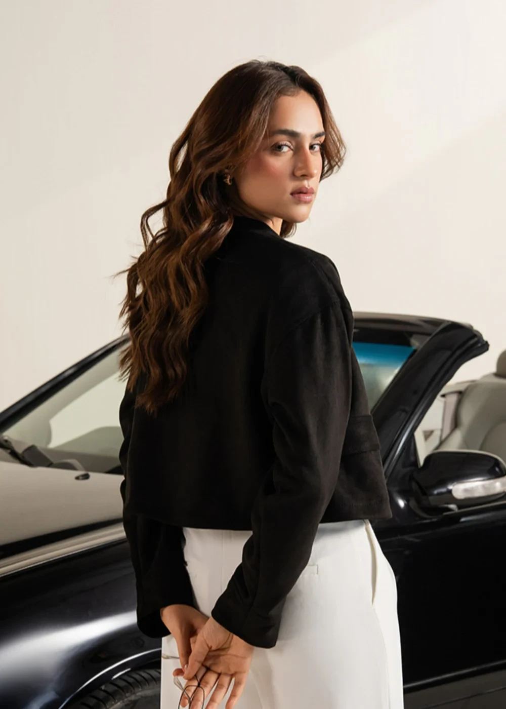 Tailored in soft-touch suede, the Cropped Suede Jacket brings together modern minimalism and timeless elegance. Its structured silhouette, cropped length, and gold-tone button detailing create a sophisticated contrast of edge and polish. Lightweight yet substantial, it transitions effortlessly from day to evening — a wardrobe statement that pairs seamlessly with high-waisted trousers or skirts.